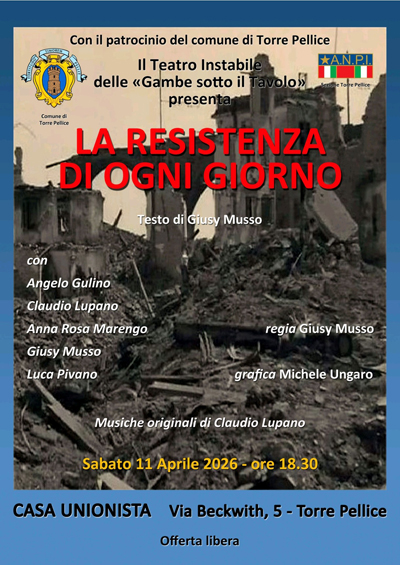 LA RESISTENZA DI OGNI GIORNO Pubblicato il 12 Aprile 2026di EzioCategorie:LE NOSTRE PRODUZIONI, TEATRO INSTABILE DELLE GAMBE SOTTO IL TAVOLO Testo di Giusy Musso. Rappresentazioni: – Torre Pellice, Torino (Casa Unionista) Sabato 11 Aprile 2026 Share on FacebookTweetSave